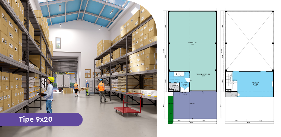 Sebagai distributor atau pengusaha, gudang adalah fasilitas pendukung penting yang dapat menunjang efisiensi rantai pasokan logistik sebelum sampai ke tangan pengguna akhir. Dengan memanfaatkan tipe gudang 2 lantai ini, kamu dapat memaksimalkan bisnis dalam satu kawasan yang terpadu sebagai kantor & tempat penyimpanan dalam 1 bangunan.