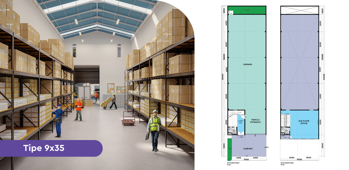 Sebagai distributor atau pengusaha, gudang adalah fasilitas pendukung penting yang dapat menunjang efisiensi rantai pasokan logistik sebelum sampai ke tangan pengguna akhir. Dengan memanfaatkan tipe gudang 2 lantai ini, kamu dapat memaksimalkan bisnis dalam satu kawasan yang terpadu sebagai kantor & tempat penyimpanan dalam 1 bangunan dengan tambahan halaman belakang.